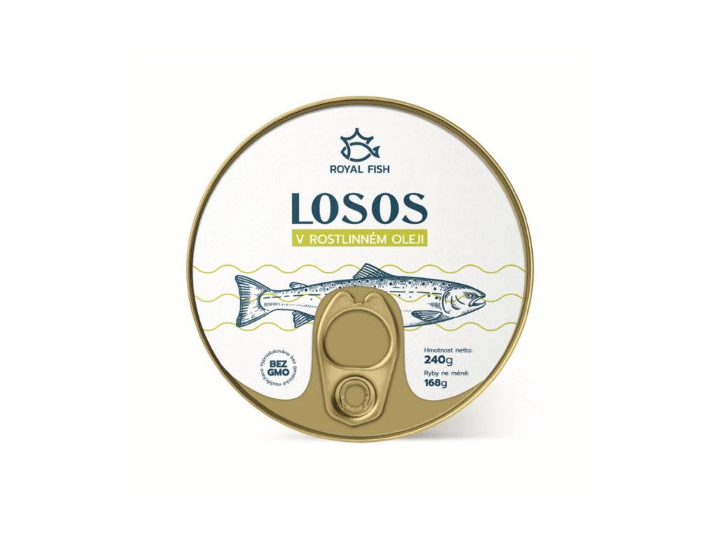 Sterilizované konzervované ryby. Výrobek je připraven k použití. Složení: Losos atlantický 70% (Salmon salar-chovný), řepkový olej, pitná voda, sůl, koření).